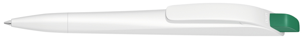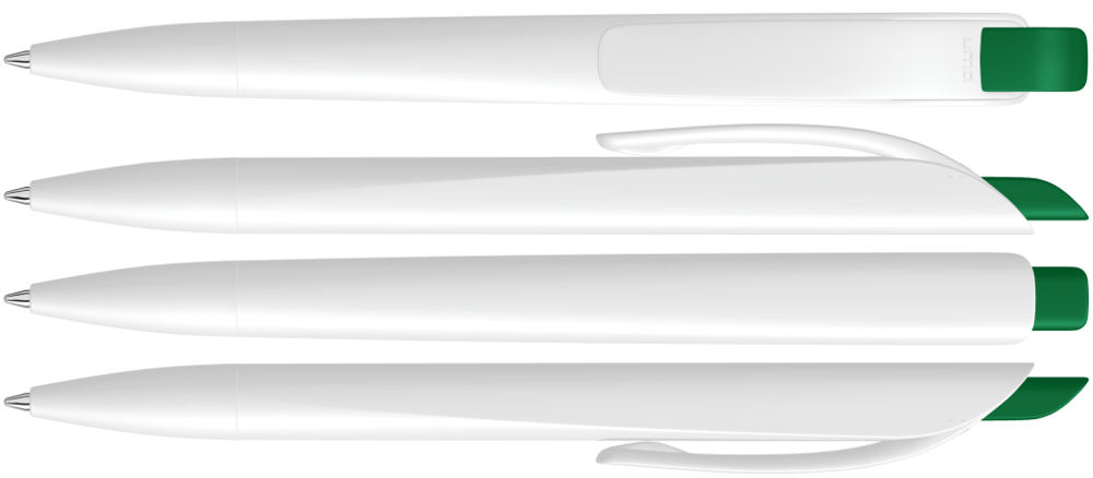 Druckkugelschreiber mit geometrisch wechselnder Schaftform. Gehäuse gedeckt matt schwarz oder weiß mit Bogenclip und farbigem Drücker.