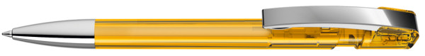 Druckkugelschreiber mit transparent glänzendem Gehäuse, flexiblem Metallclip und schwerer Metallspitze glanzverchromt.