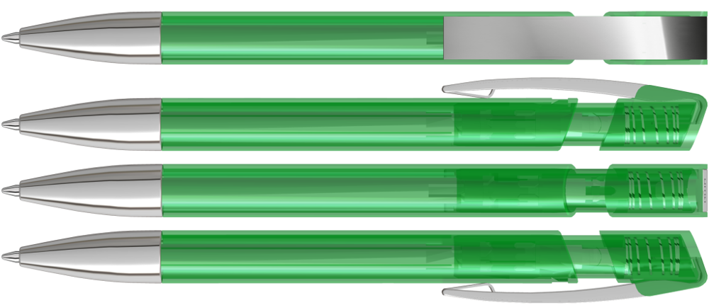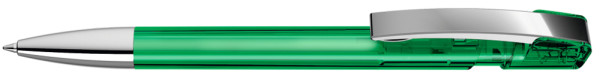 Druckkugelschreiber mit transparent glänzendem Gehäuse, flexiblem Metallclip und schwerer Metallspitze glanzverchromt.