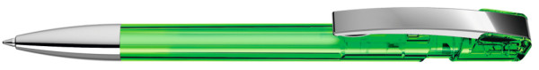 Druckkugelschreiber mit transparent glänzendem Gehäuse, flexiblem Metallclip und schwerer Metallspitze glanzverchromt.