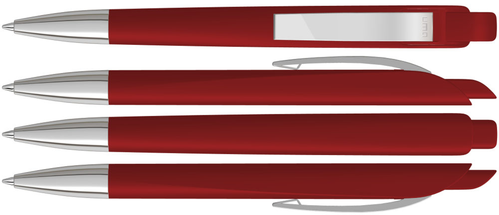 Druckkugelschreiber mit geometrisch wechselnder Schaftform. Gehäuse und Drücker gedeckt matt, Metallclip und Metallspitze glanzverchromt.