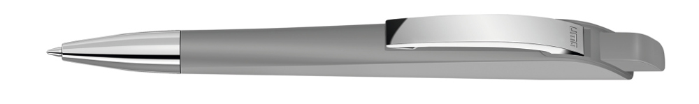 Druckkugelschreiber mit geometrisch wechselnder Schaftform. Gehäuse und Drücker gedeckt matt, Metallclip und Metallspitze glanzverchromt.