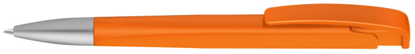 Druckkugelschreiber mit geometrisch wechselnder Schaftform, matt gedecktem Gehäuse und Metallspitze matt verchromt.