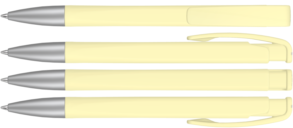 Druckkugelschreiber mit geometrisch wechselnder Schaftform, matt gedecktem Gehäuse und Metallspitze matt verchromt.