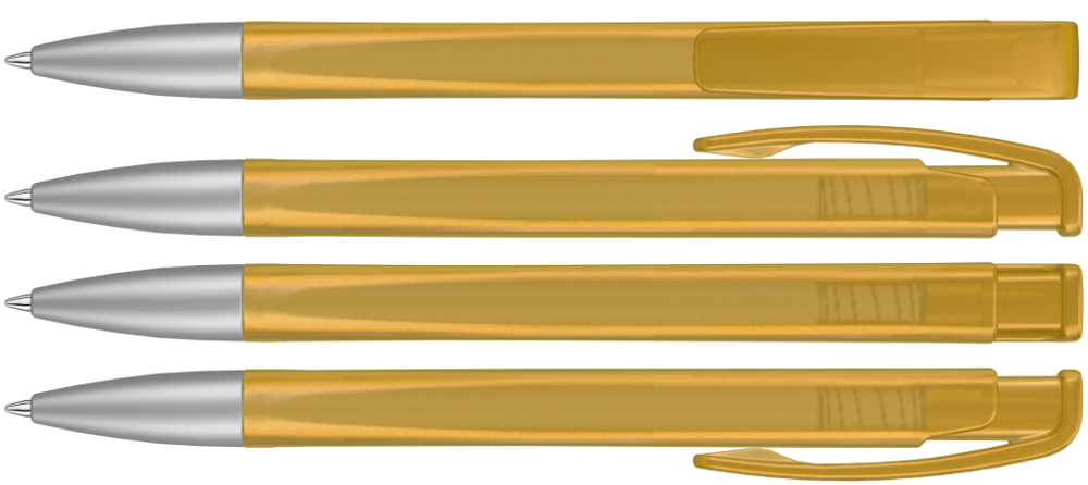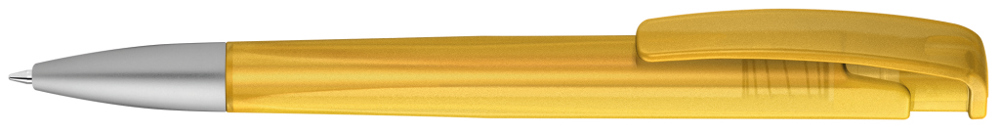 Druckkugelschreiber mit geometrisch wechselnder Schaftform, transparent gefrostetem Gehäuse und Metallspitze matt verchromt.