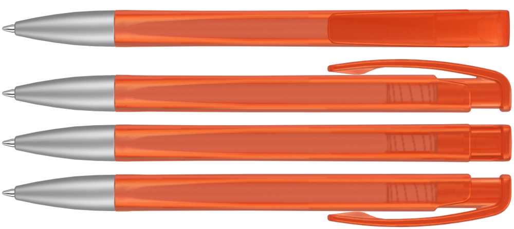 Druckkugelschreiber mit geometrisch wechselnder Schaftform, transparent gefrostetem Gehäuse und Metallspitze matt verchromt.