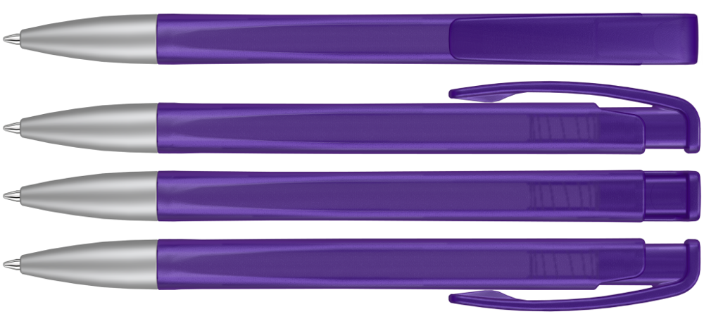 Druckkugelschreiber mit geometrisch wechselnder Schaftform, transparent gefrostetem Gehäuse und Metallspitze matt verchromt.