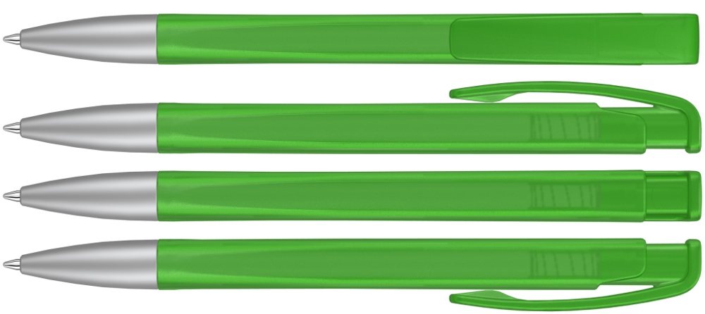 Druckkugelschreiber mit geometrisch wechselnder Schaftform, transparent gefrostetem Gehäuse und Metallspitze matt verchromt.