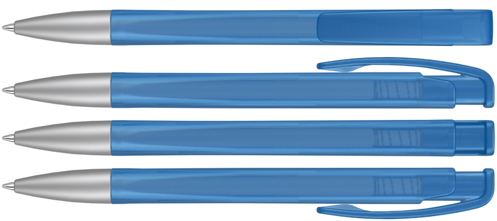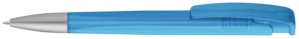 Druckkugelschreiber mit geometrisch wechselnder Schaftform, transparent gefrostetem Gehäuse und Metallspitze matt verchromt.