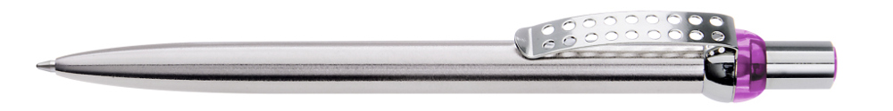 Metall-Druckkugelschreiber mit verchromtem und lackiertem Schaft. Obere Halbkugel und Stopfen farbig transparent. Gelochter Metallclip, Drücker und untere Halbkugel verchromt.