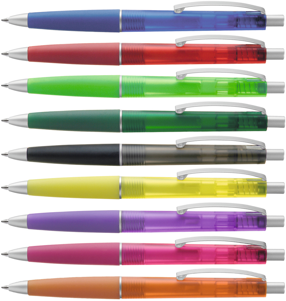 Druckkugelschreiber mit transparent gefrostetem Gehäuse, Gummigriffzone und geschwungenem... mehr