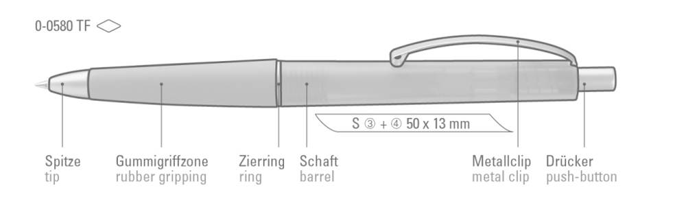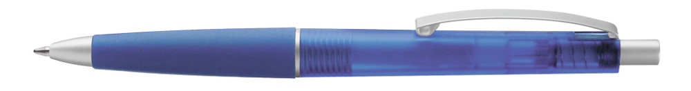 Druckkugelschreiber mit transparent gefrostetem Gehäuse, Gummigriffzone und geschwungenem Metallclip. Drücker, Zierring und Spitze in matt silber.