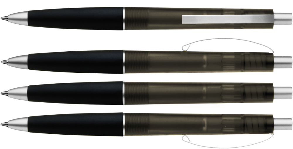 Druckkugelschreiber mit transparent gefrostetem Gehäuse, Gummigriffzone und geschwungenem... mehr
