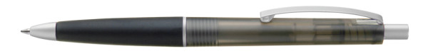 Druckkugelschreiber mit transparent gefrostetem Gehäuse, Gummigriffzone und geschwungenem Metallclip. Drücker, Zierring und Spitze in matt silber.