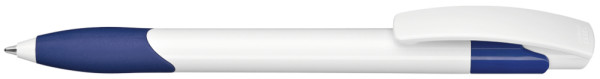 Druckkugelschreiber mit gedeckt glänzendem Schaft und Clipdrücker in weiß. Gummigriffzone und Manschette farbig.
