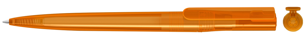 Drehkugelschreiber aus recyceltem PET-Material mit transparent glänzendem Gehäuse.