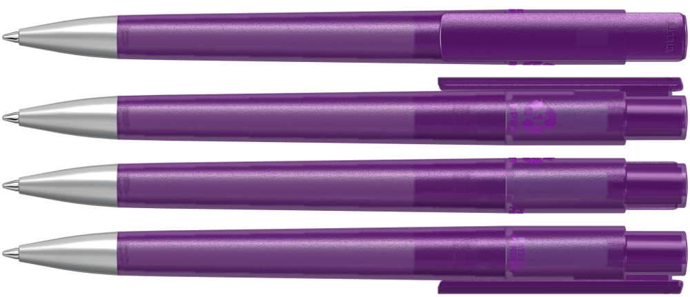 Druckkugelschreiber aus recyceltem PET-Material mit transparent gefrostetem Gehäuse und Clip sowie Metallspitze aus recyceltem Aluminium in silber matt.