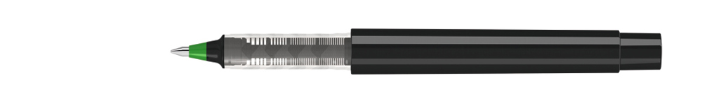 Rollerball mit Gehäuse aus recyceltem PET-Material in gedeckt glänzend weiß oder schwarz. Stopfen in den 8 möglichen Schreibfarben.