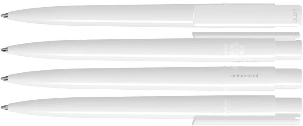 Druckkugelschreiber aus recyceltem, antibakteriellem und antiviralem rPET in gedeckt glänzendem Gehäuse und Clip. Der nach ISO 22196 und ISO 21702 geprüfte antimikrobielle Zusatz verleiht dem rPET eine antibakterielle und antivirale Wirkung auch gegen Corona-Viren. Die Haftung und Ansiedlung von Bakterien oder Krankheitserregern auf der Oberfläche des Schreibgerätes wird um 99,99% verringert. Der in das rPET Material eingearbeitete antimikrobielle Zusatz kann nicht abgerieben oder abgegeben werden und wirkt über die gesamte Lebensdauer des Schreibgerätes. Eine dauerhafte Reduzierung von Krankheitserregern ist gegeben.