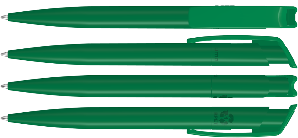 Druckkugelschreiber aus recyceltem PET-Material mit gedeckt glänzendem Gehäuse und Stopfen.
