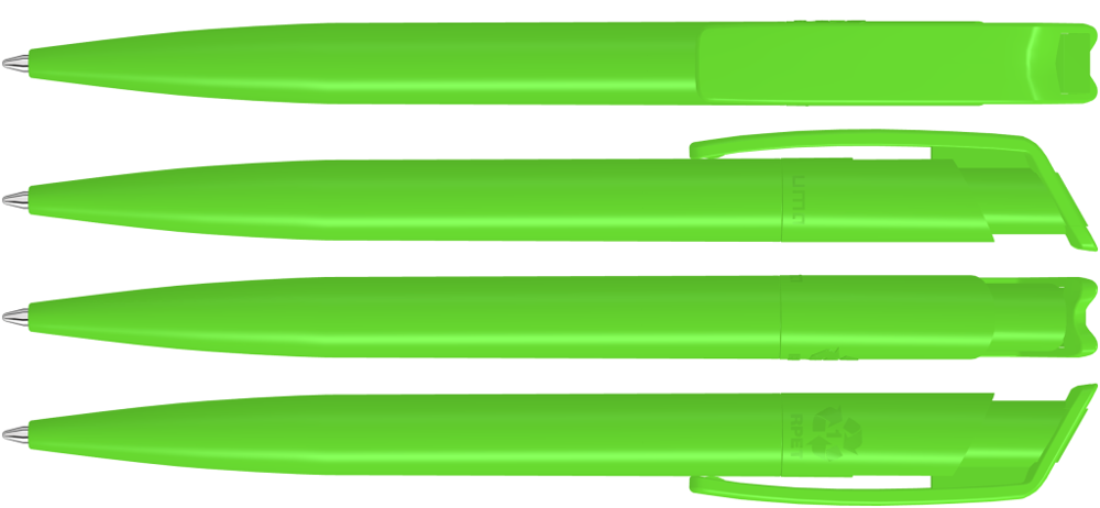 Druckkugelschreiber aus recyceltem PET-Material mit gedeckt glänzendem Gehäuse und Stopfen.