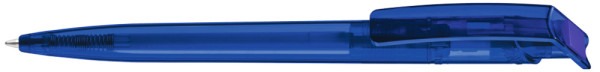 Druckkugelschreiber aus recyceltem PET-Material mit transparent glänzendem Gehäuse und gedecktem Stopfen.