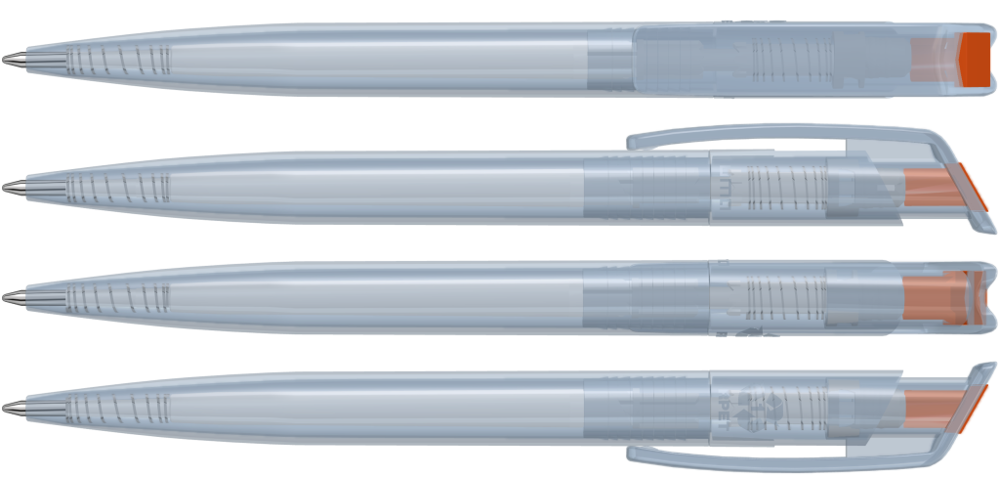 Druckkugelschreiber aus recyceltem PET-Material mit klar transparent glänzendem Gehäuse und gedecktem Stopfen.