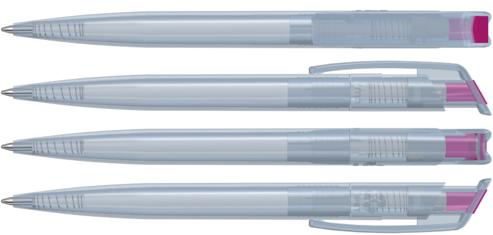 Druckkugelschreiber aus recyceltem PET-Material mit klar transparent glänzendem Gehäuse und gedecktem Stopfen.