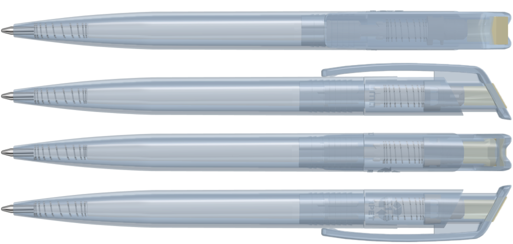 Druckkugelschreiber aus recyceltem PET-Material mit klar transparent glänzendem Gehäuse und gedecktem Stopfen.