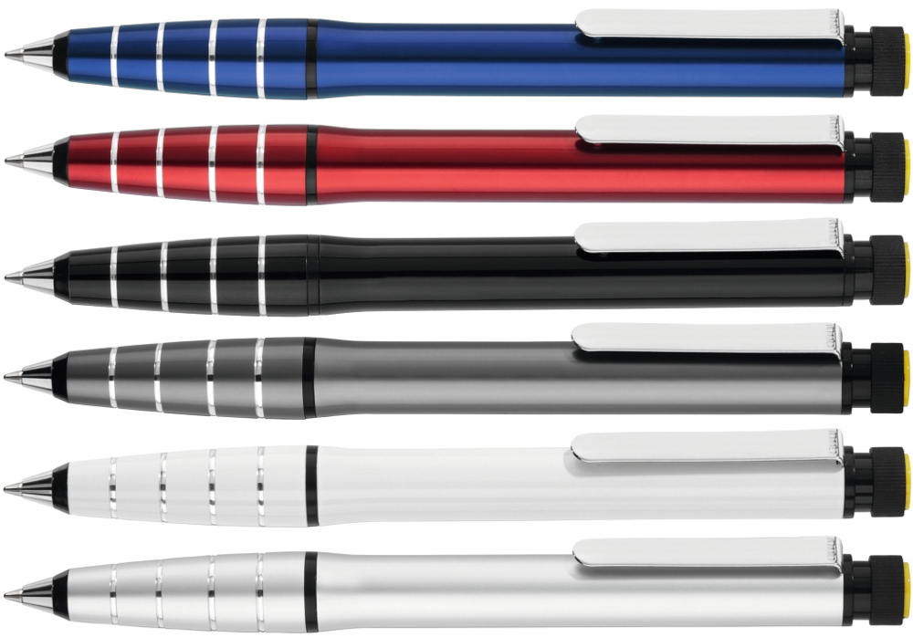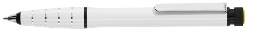Metall-Drehkugelschreiber aus Aluminium mit integriertem gelb schreibenden Textmarker im Schaft. Der Textmarker lässt sich mittels Drehbewegung aus dem Schaft herausnehmen und kann separat genutzt werden.