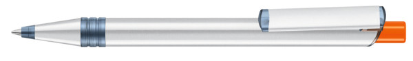 Metall-Druckkugelschreiber mit Metallspitze, Metallschaft und Metallclip aus recyceltem Aluminium, Kunststoffteile aus recyceltem PET-Material in klar transparent und gedeckt farbigem Drücker.