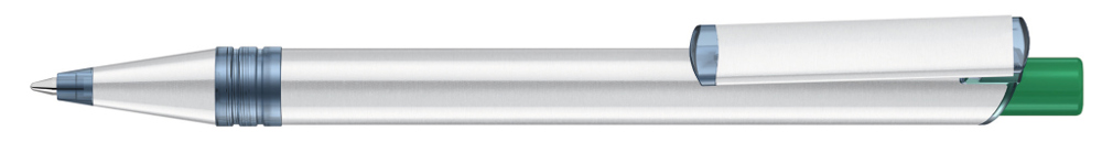 Metall-Druckkugelschreiber mit Metallspitze, Metallschaft und Metallclip aus recyceltem Aluminium, Kunststoffteile aus recyceltem PET-Material in klar transparent und gedeckt farbigem Drücker.