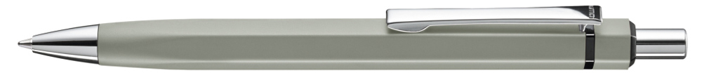 Metall-Druckkugelschreiber mit matt lackiertem, sechskantigem Aluminiumschaft. Metallclip, Metallspitze und Drücker silber glänzend. Zierring schwarz glänzend.