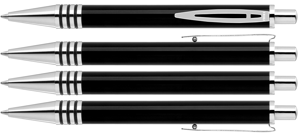 Metall-Druckkugelschreiber mit glänzend lackiertem Aluminiumschaft und 3 eingelassenen, kombinierbaren Gummiringen. Metallbeschlagteile glanzverchromt.