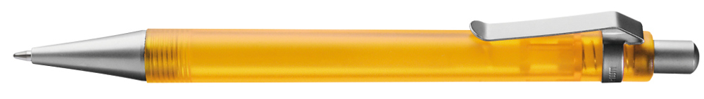 Druckkugelschreiber mit transparent gefrostetem oder gedecktem Gehäuse. Metalldrücker, Metallclip und Metallspitze matt verchromt.