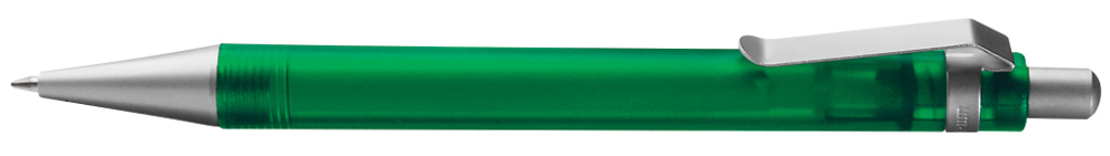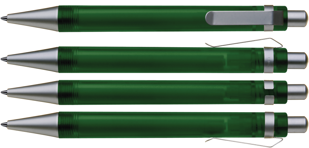 Druckkugelschreiber mit transparent gefrostetem oder gedecktem Gehäuse. Metalldrücker, Metallclip und Metallspitze matt verchromt.
