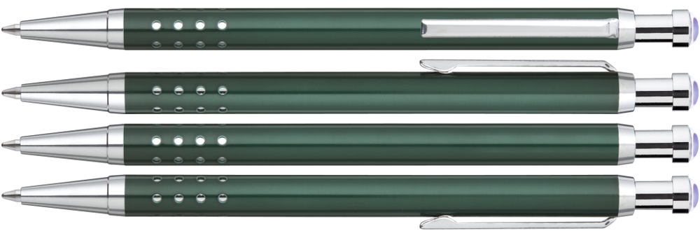 Metall-Druckkugelschreiber lackiert mit gelochter Griffzone. Metallbeschlagteile glanzverchromt. Drücker mit individuell gestaltetem Doming.