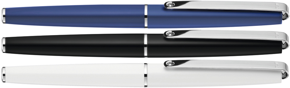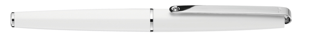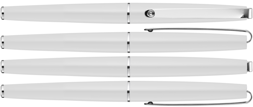 Metall-Rollerball mit glänzendem Gehäuse. Langer flexibler Metallclip, Zierring und Stopfen glanzverchromt. Griffzone gerillt glanzverchromt.
