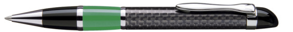 Edler Carbonfaser Metalldrehkugelschreiber mit farbiger Griffzone, flexiblem Metallclip, Metallzierring und Metallspitze glanzverchromt.