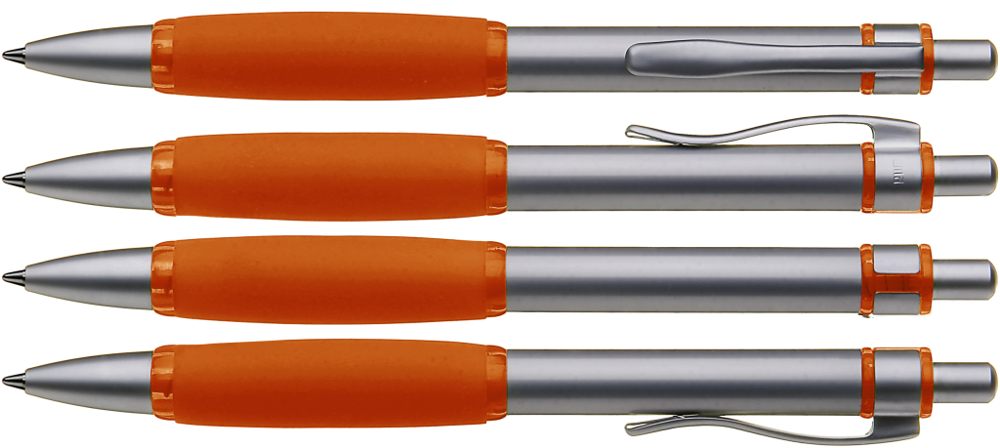 Metall-Druckkugelschreiber mit Schaft, Drücker, Clip und Spitze glanzverchromt. Große, farbige Gummigriffzone.