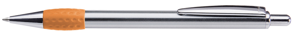 Metall-Druckkugelschreiber mit Schaft, Drücker, Clip und Spitze glanzverchromt. Gummigriffzone farbig.