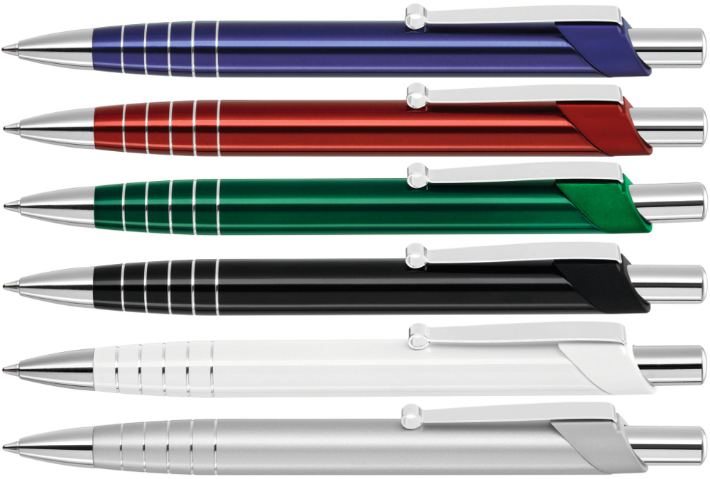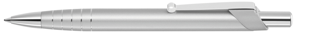 Metall-Druckkugelschreiber mit silbernen Zierringen im Gehäuse und elastischem Metallclip. Spitze und Drücker silber glänzend.