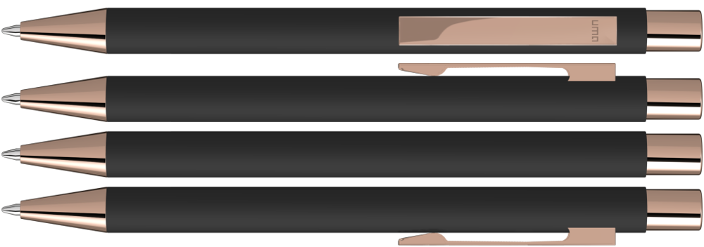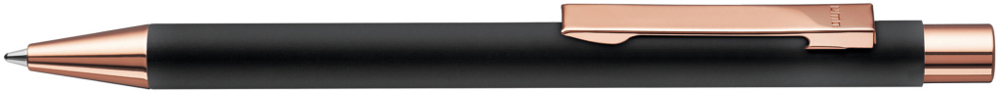 Metall-Druckkugelschreiber mit Softtouch-Gehäuse in schwarz. Metallclip, Metallspitze und Drücker roségold glänzend.