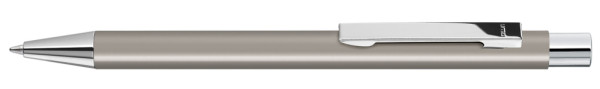 Metall-Druckkugelschreiber mit mattem Gehäuse. Metallclip, Metallspitze und Drücker silber glänzend.