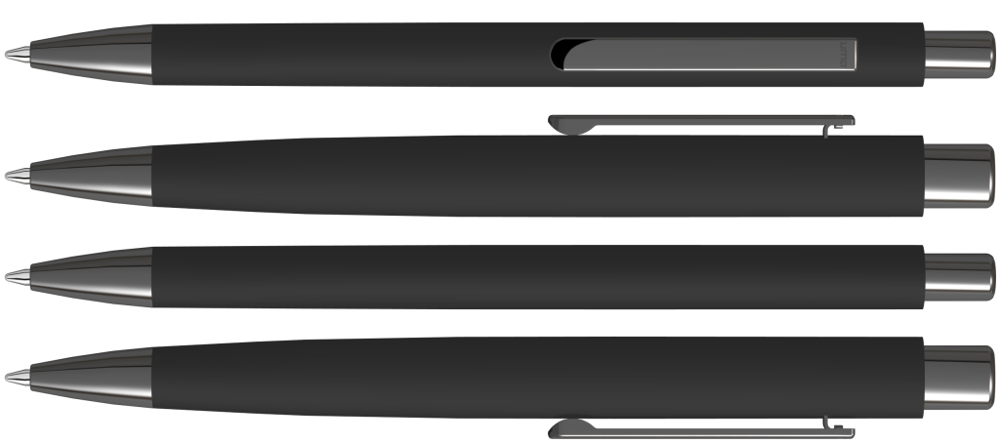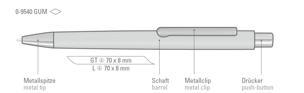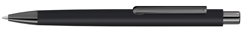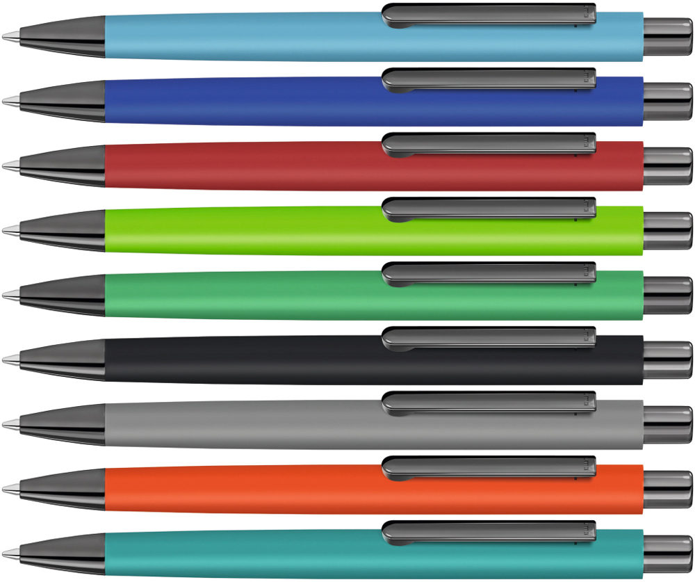 Metall-Druckkugelschreiber mit ellipsenförmigem Softtouch-Gehäuse. Metallclip, Metallspitze und ellipsenförmiger Drücker GUN metallic.