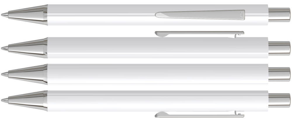 Metall-Druckkugelschreiber mit mattem Dreikantgehäuse, Metallclip, Metallspitze und Drücker in silber glänzend.