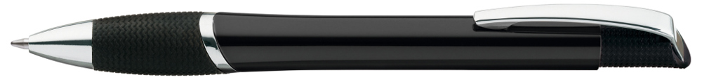 Metall-Druckkugelschreiber mit glänzendem Gehäuse, schwarzer Gummigriffzone und glanzverchromten Beschlagteilen.