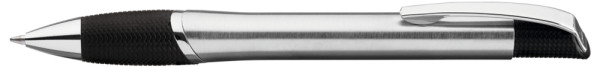 Metall-Druckkugelschreiber mit glänzendem Gehäuse, schwarzer Gummigriffzone und glanzverchromten Beschlagteilen.