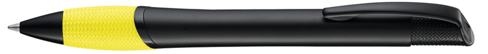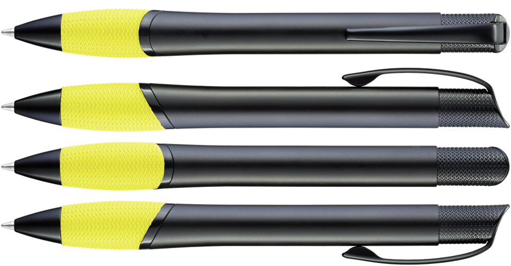 Metall-Druckkugelschreiber mit schwarz matt lackiertem Gehäuse, farbige Gummigriffzone und matt schwarzen Beschlagteilen.