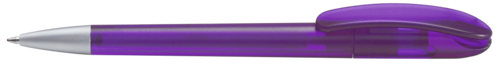Drehkugelschreiber mit transparent gefrostetem Gehäuse. Schwere matt verchromte Metallspitze.